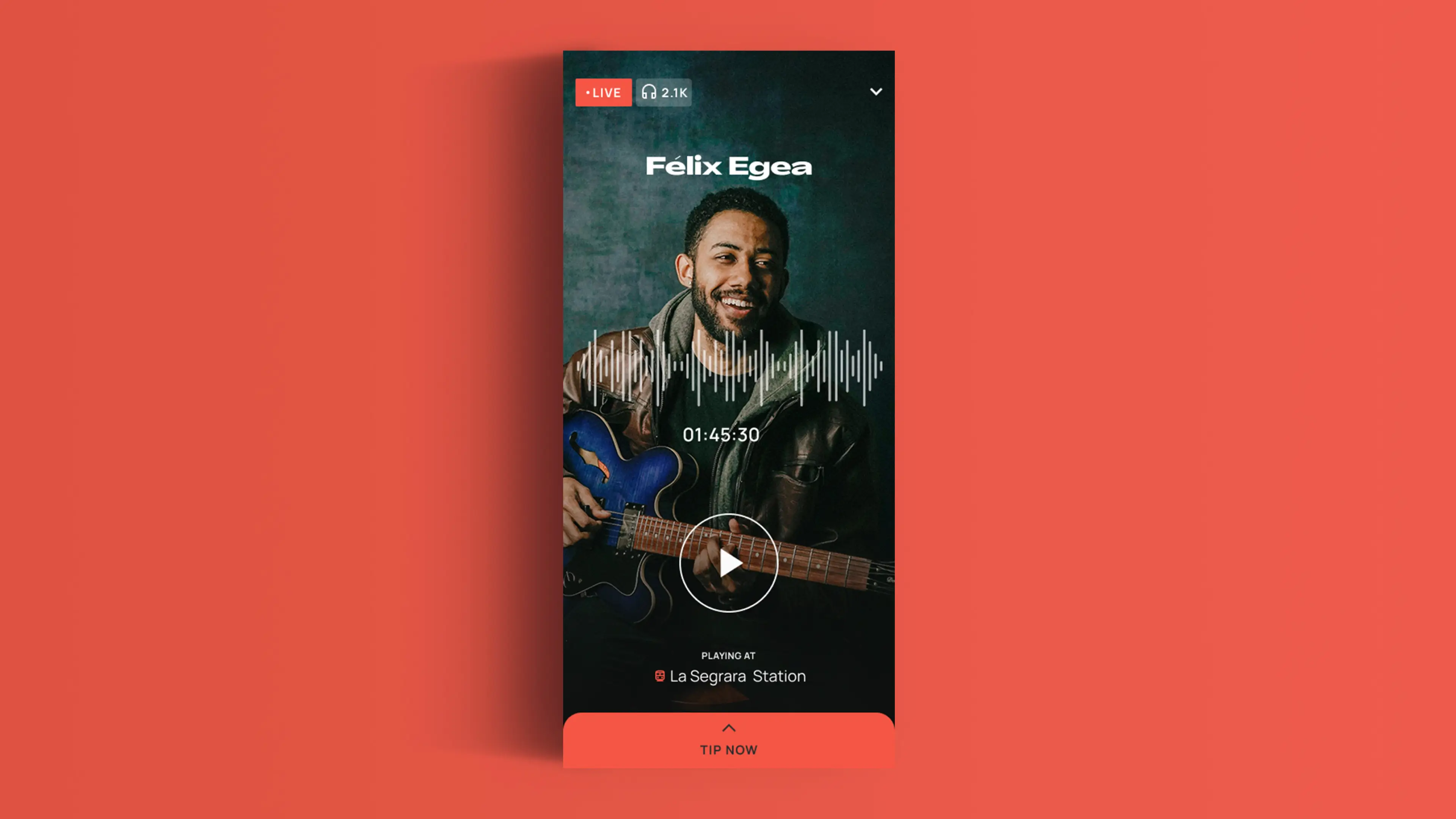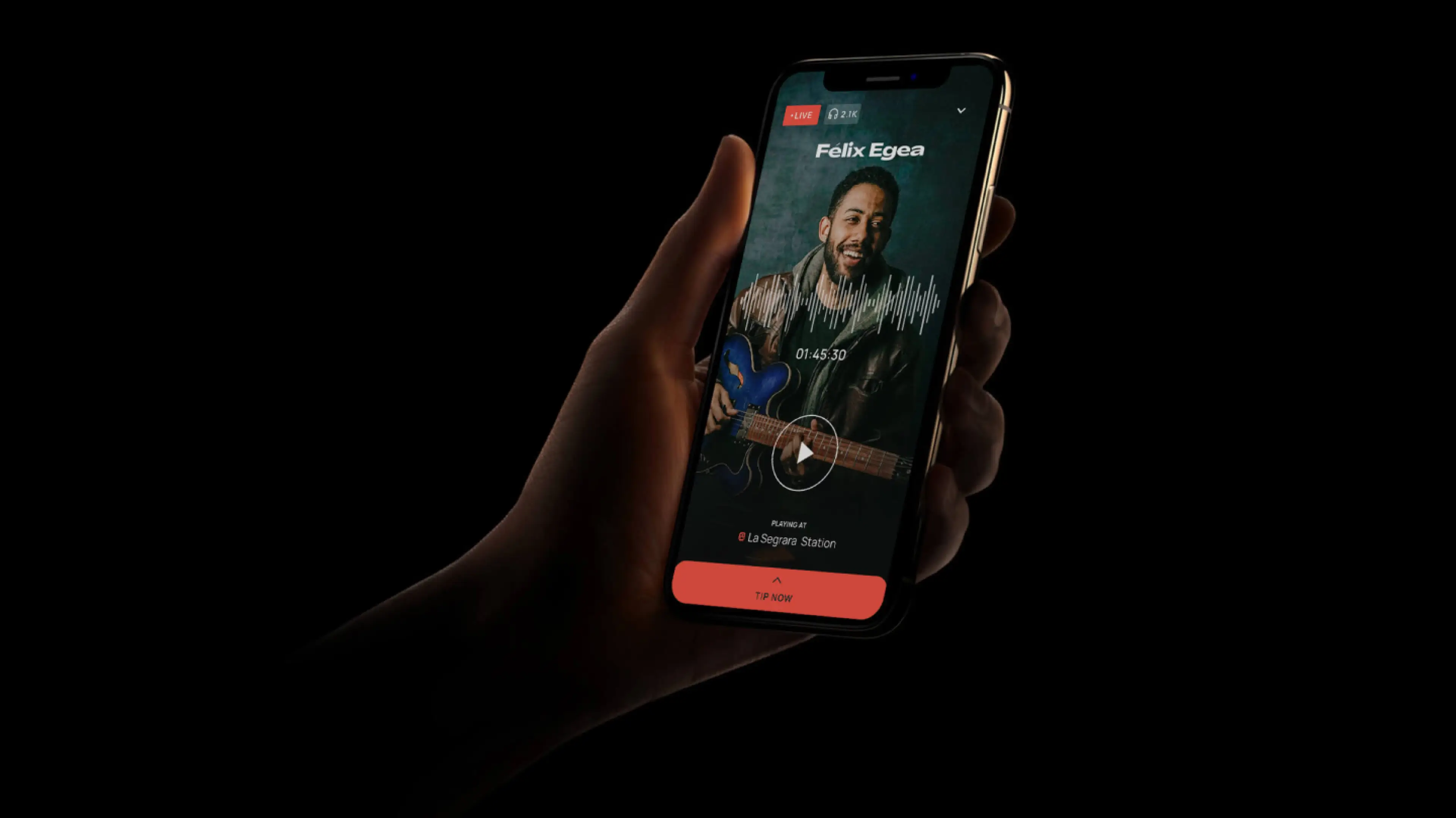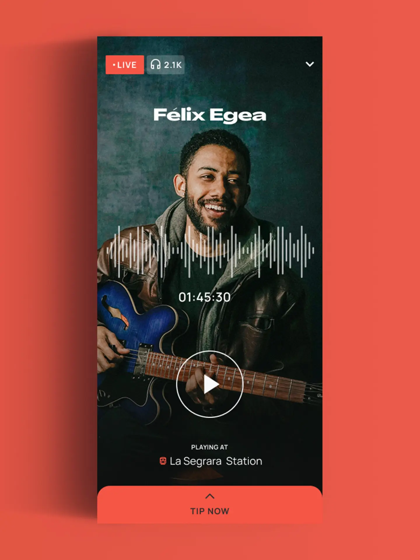 Led UX/UI design through field research, interviews, and user flow development. Created QR-scanning for live audio streams, a proximity-based discovery map, and an interactive swipe-up tipping interface.