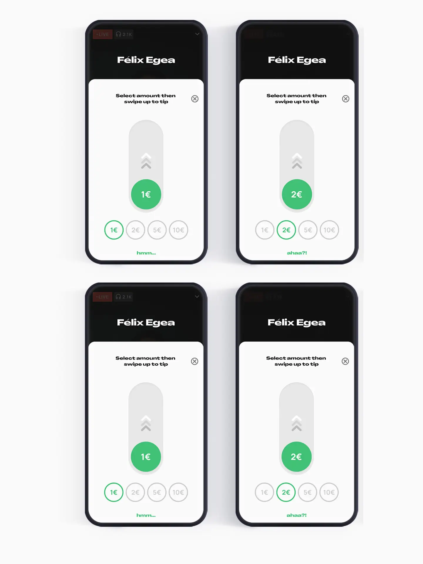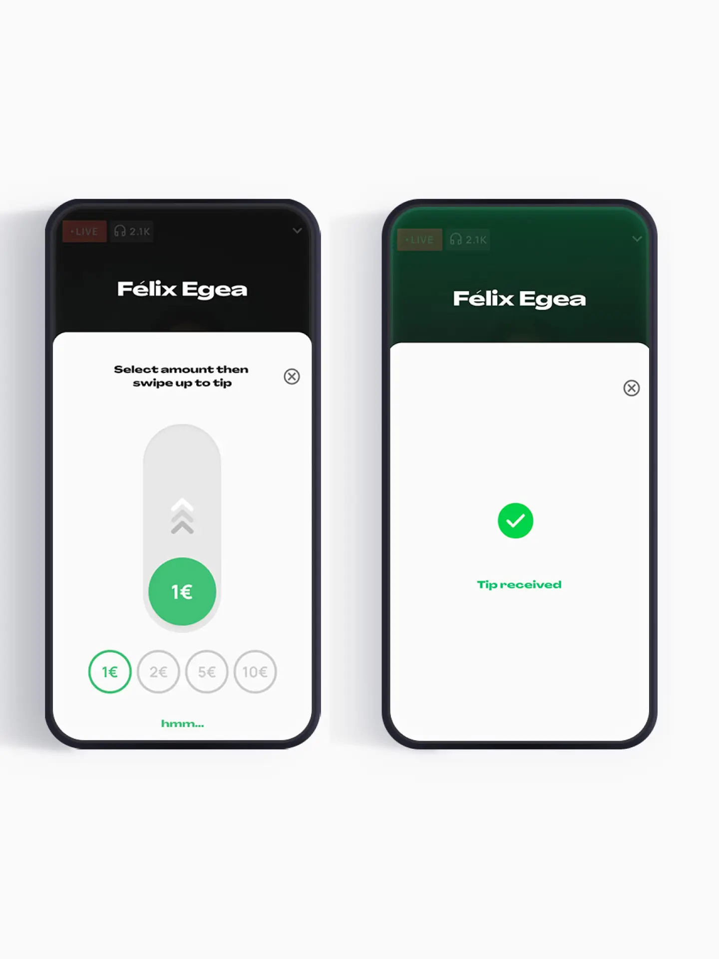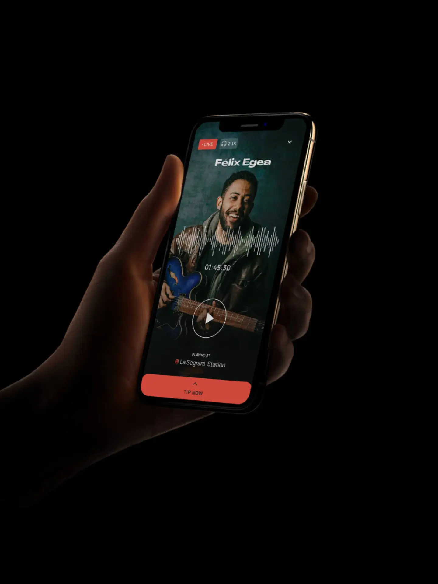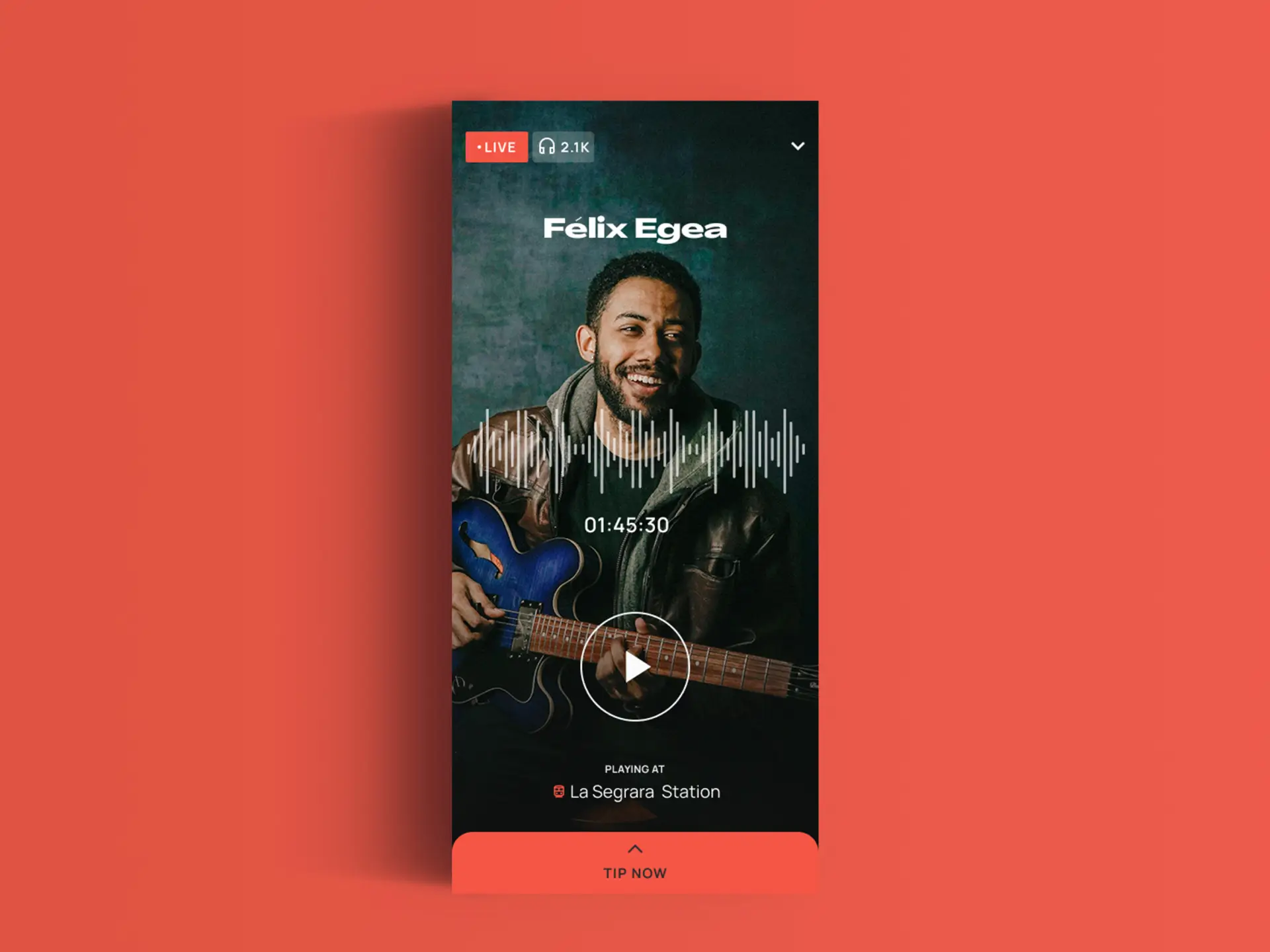 Led UX/UI design through field research, interviews, and user flow development. Created QR-scanning for live audio streams, a proximity-based discovery map, and an interactive swipe-up tipping interface.